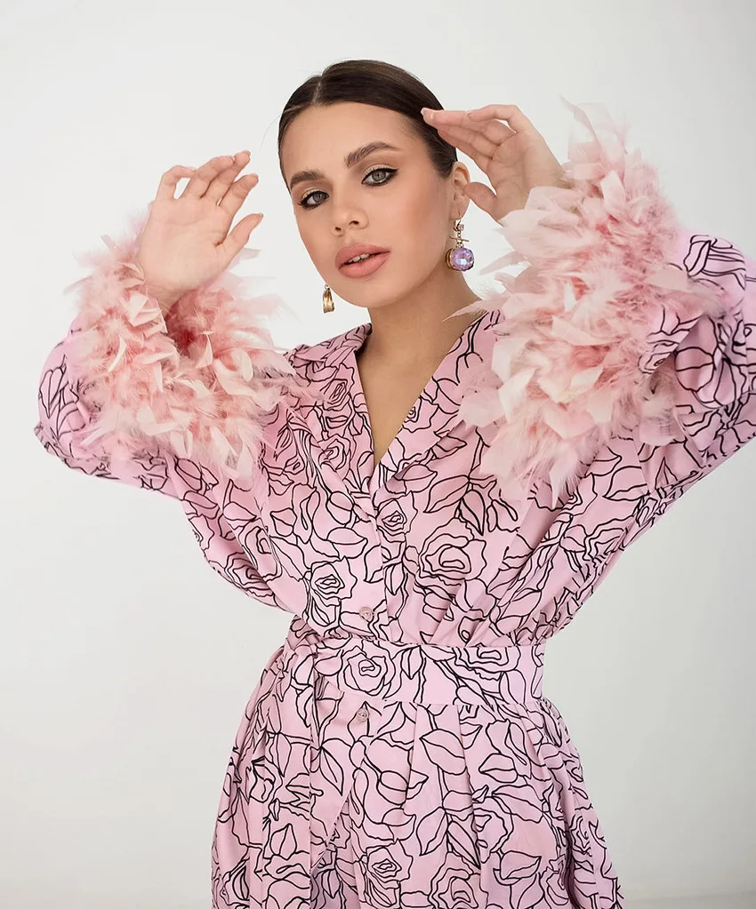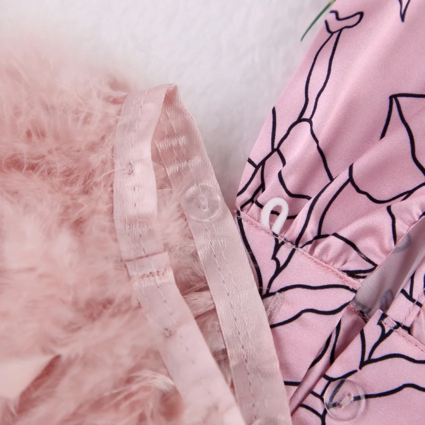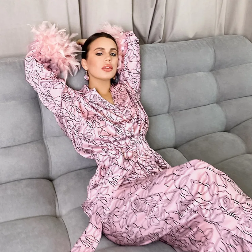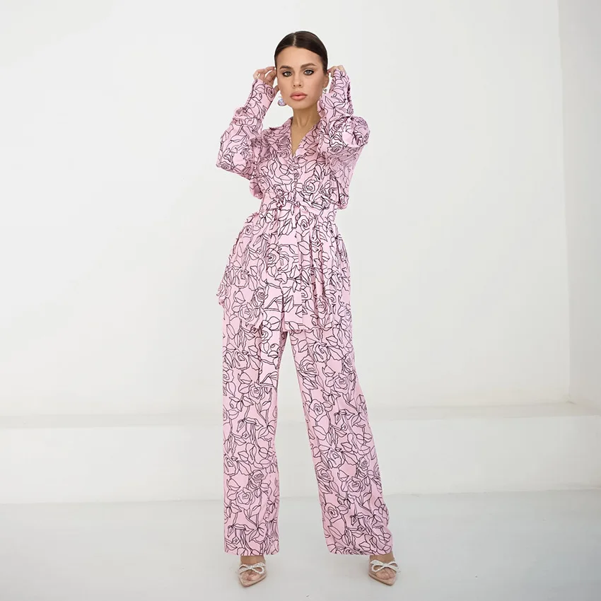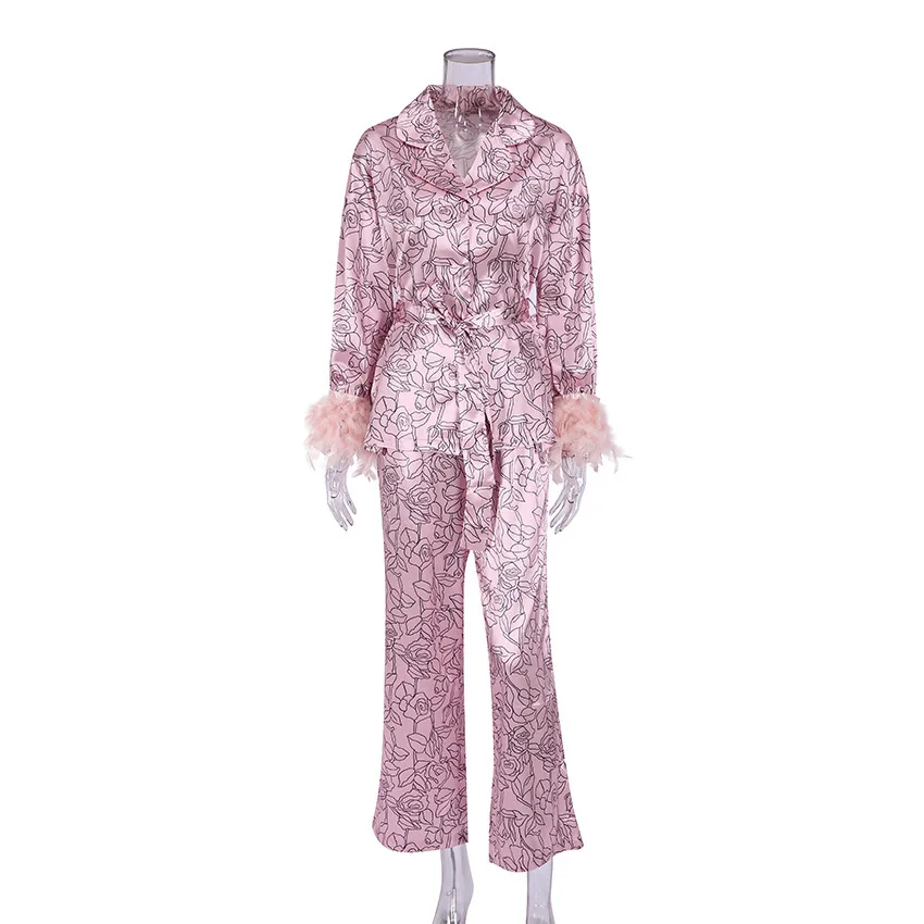 Flowers Print Feather Sleeves Sleepwear Abstract Pattern Loungewear Women Pajama Fashion Women's Clothing Sets Suit