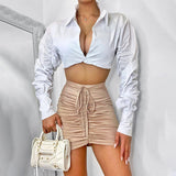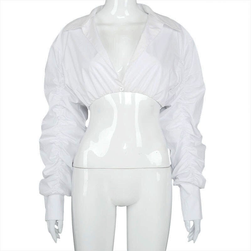 goosudu Long Puff Sleeve Solid Botton Ruched Patchwork Tshirt Top Autumn Winter Women Fashion Sexy Party Club Outfits