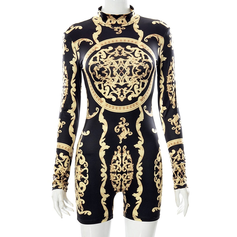 woloong Classical Print O Neck Long Sleeve Playsuit New Year Sexy Slim Sports Elegant Casual Streetwear Concise Y2K