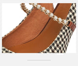 woloong New Sandles Women Square Toe Thick Heel French Retro Women Shoes Pearl Buckle High Heel Party Sandals Houndstooth Pattern