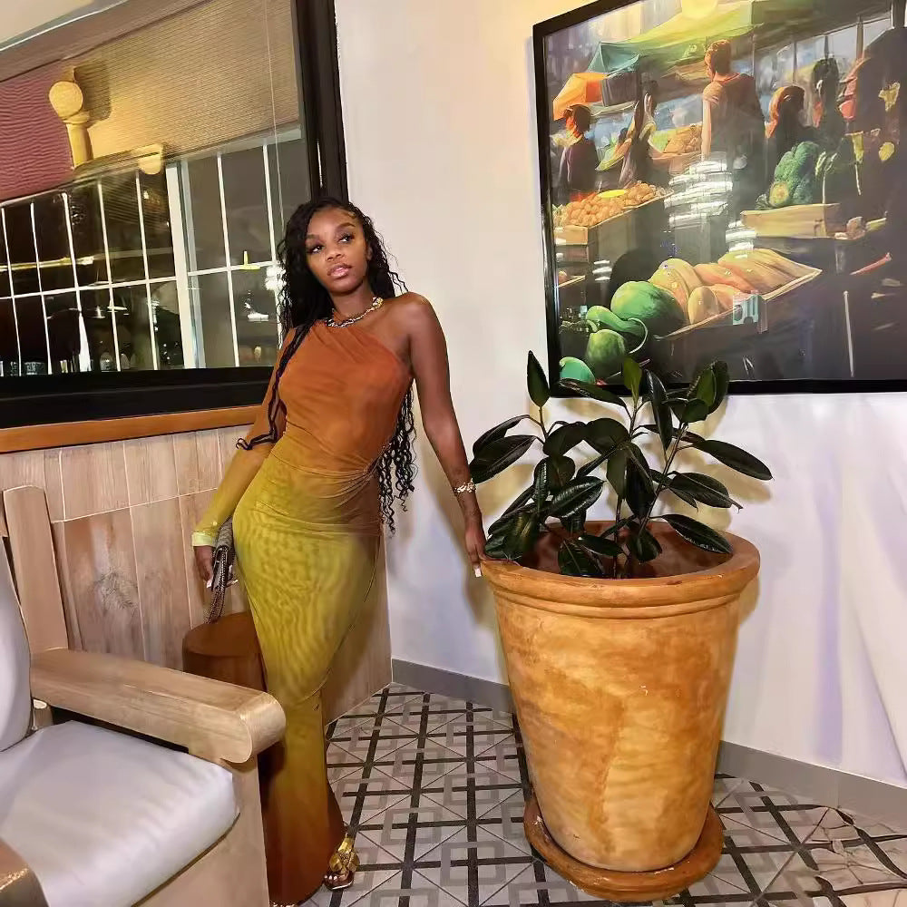 M6029 European and American 2025 Summer Fashion Printed Sexy Shoulder Single Sleeve Gradient Color Sheath Dress
