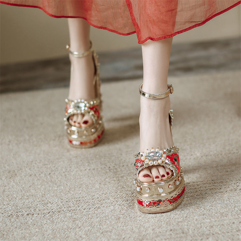goosudu Luxury Gold Metallic Women Sandals Studded Square Heels Female Shoes Platform Flower Crystal Sexy Peep Toe Summer Ladies Pumps