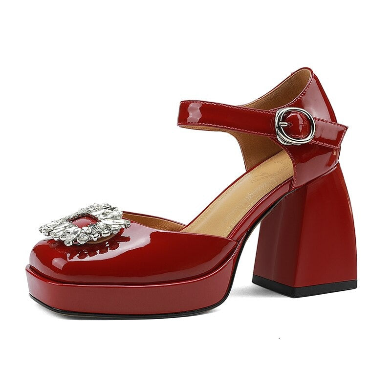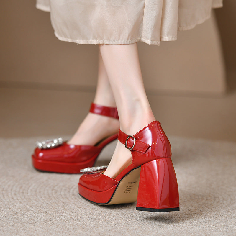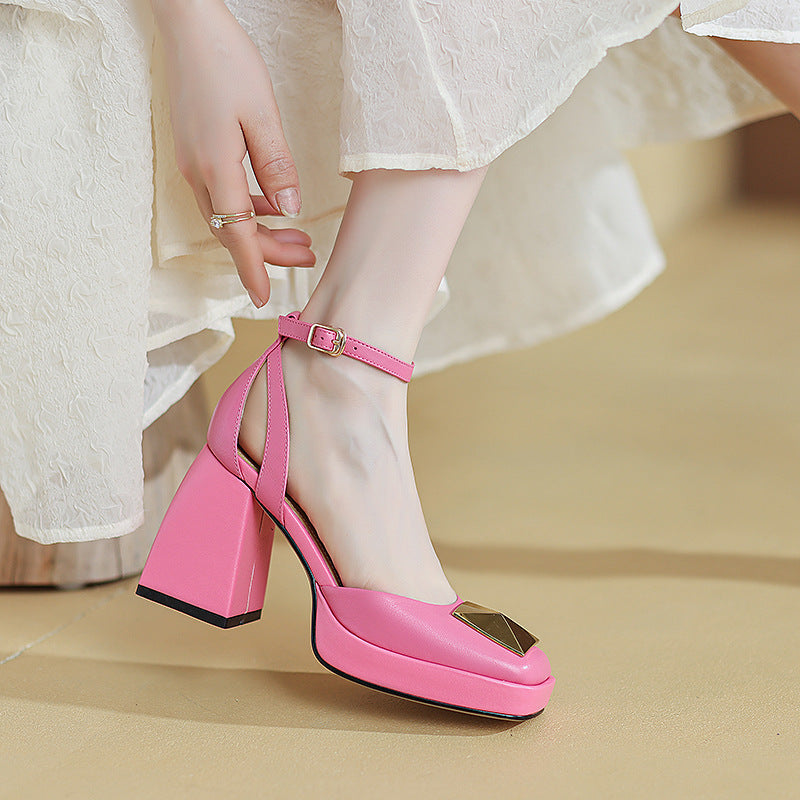 goosudu Women Shoes Summer Leather Thick High Heels Platform Shoes Black Beige Sweet Dress Party Wedding Mary Janes Pumps