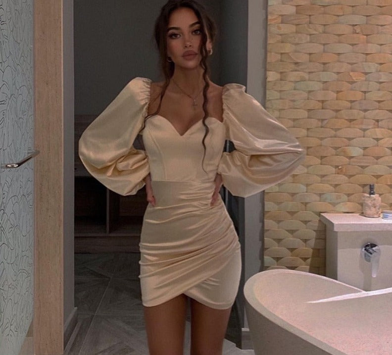 goosudu Long Lantern Sleeve Solid Square Collar Ruched Zip Up Patchwork Mini Dress Spring Summer Women Elegant Partywear Spring pretty girl outfits