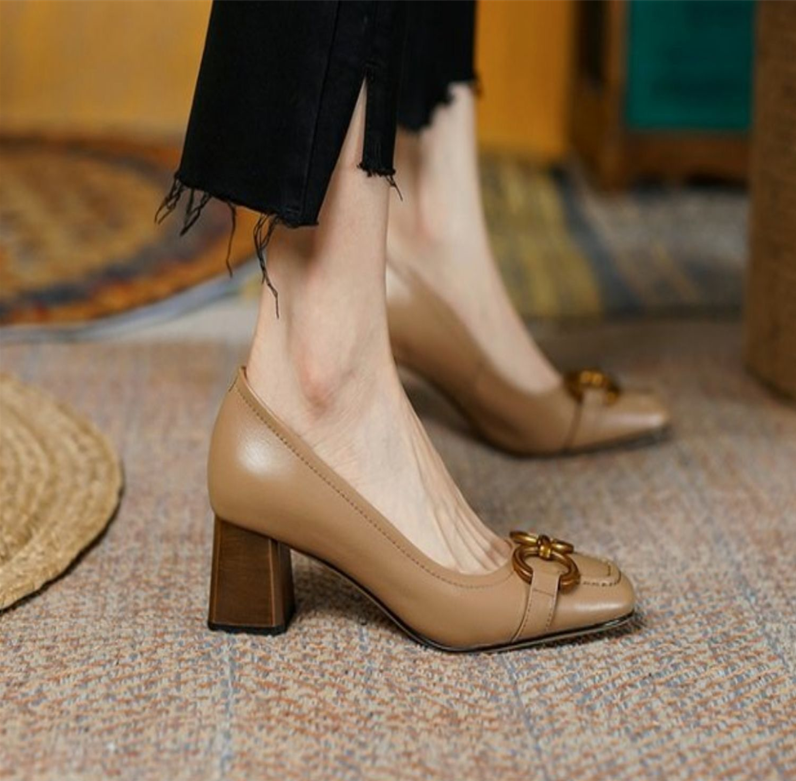 goosudu New High Heels Shoes Women's Beige Apricot Elegant Metal Decorations Professional Style Shose Office Lady Pumps