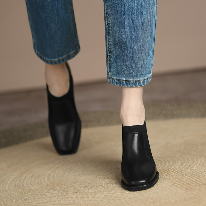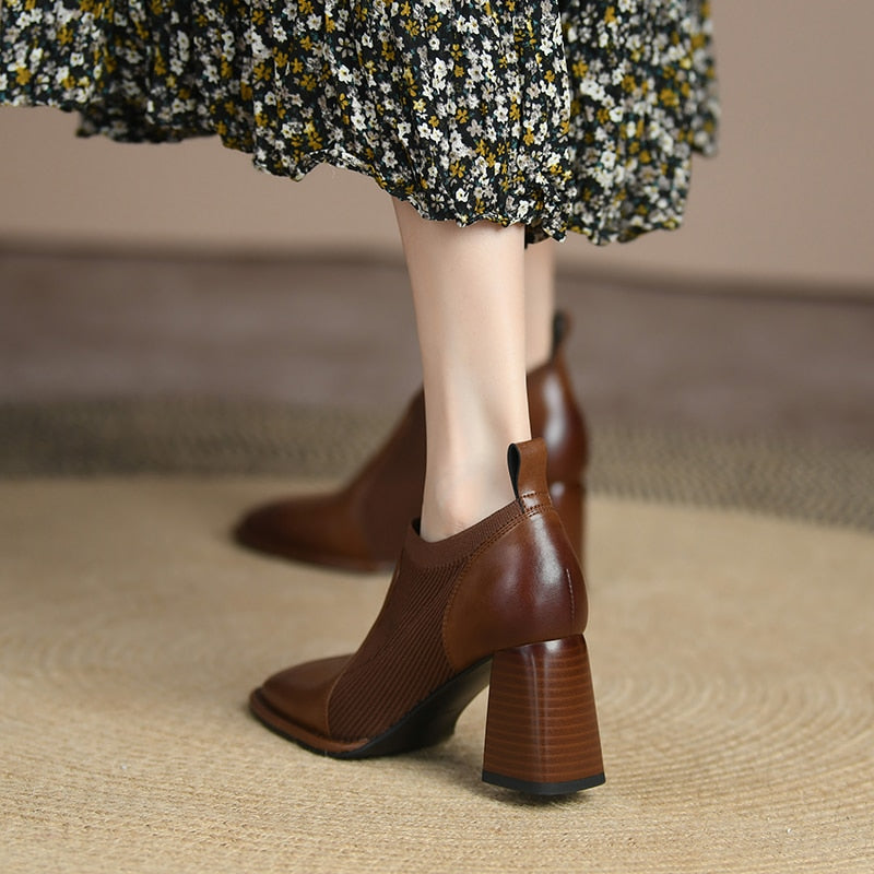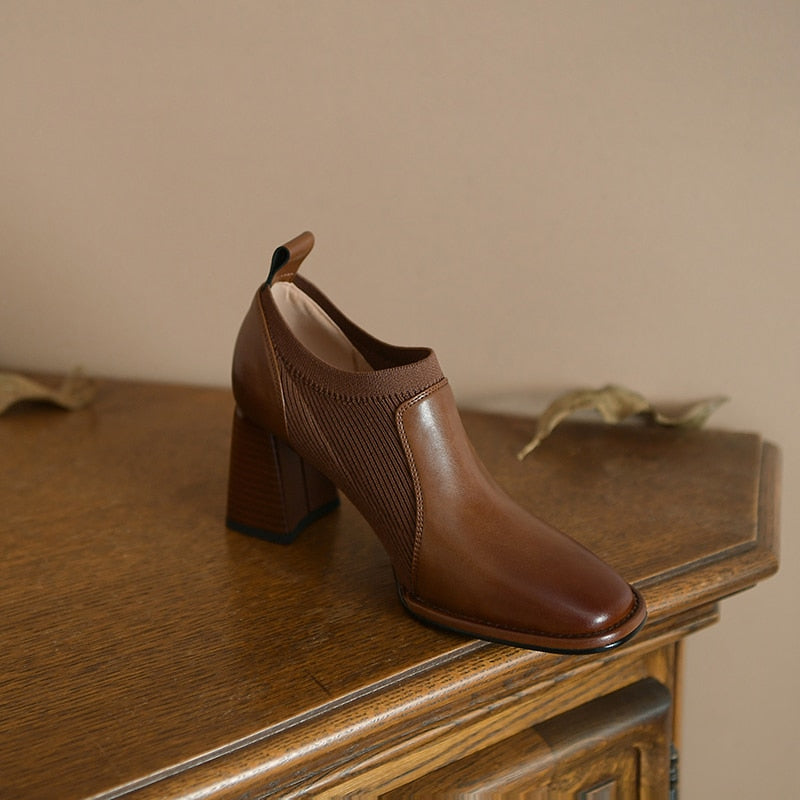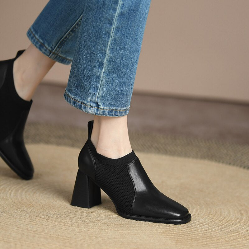 goosudu Spring/Autumn Women Party Prom Chunky Heel Pumps Genuine Leather Pumps Square Toe Loafers Woman High Heels Shoes for Women