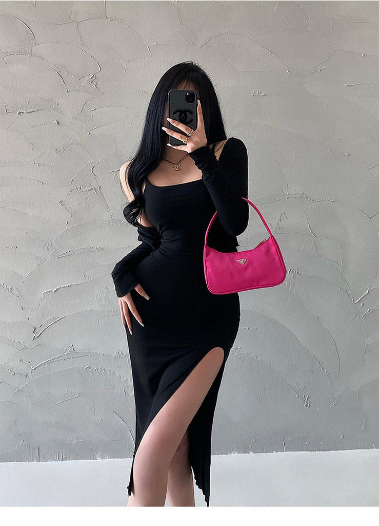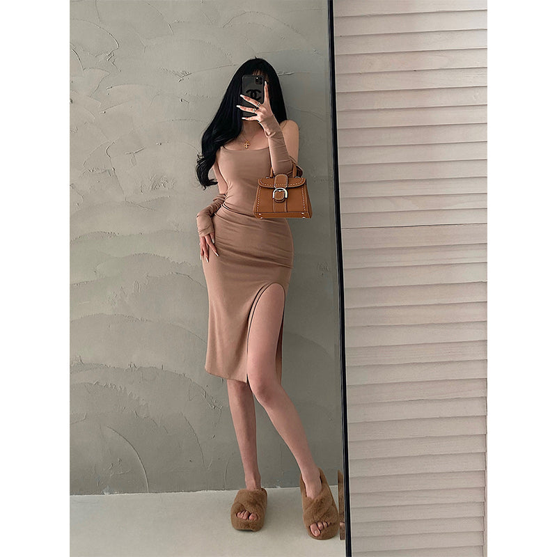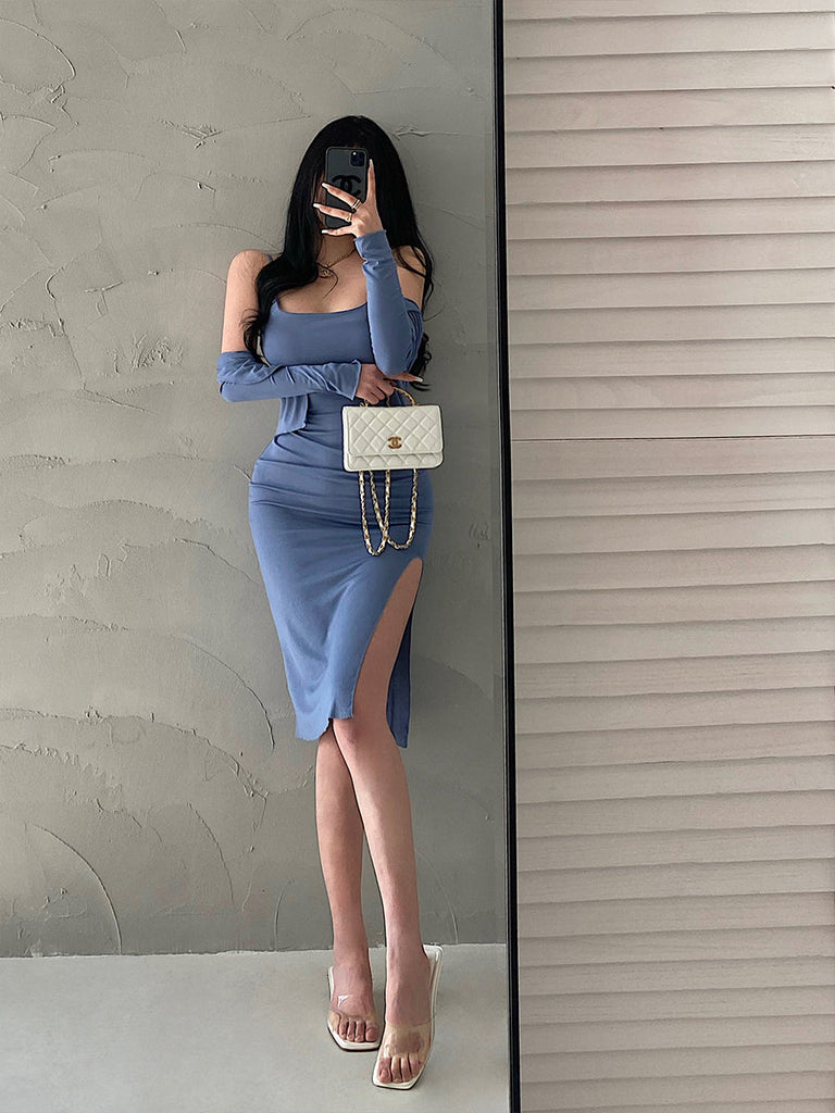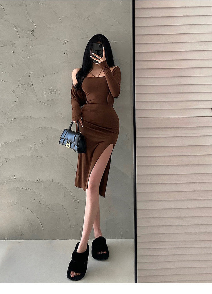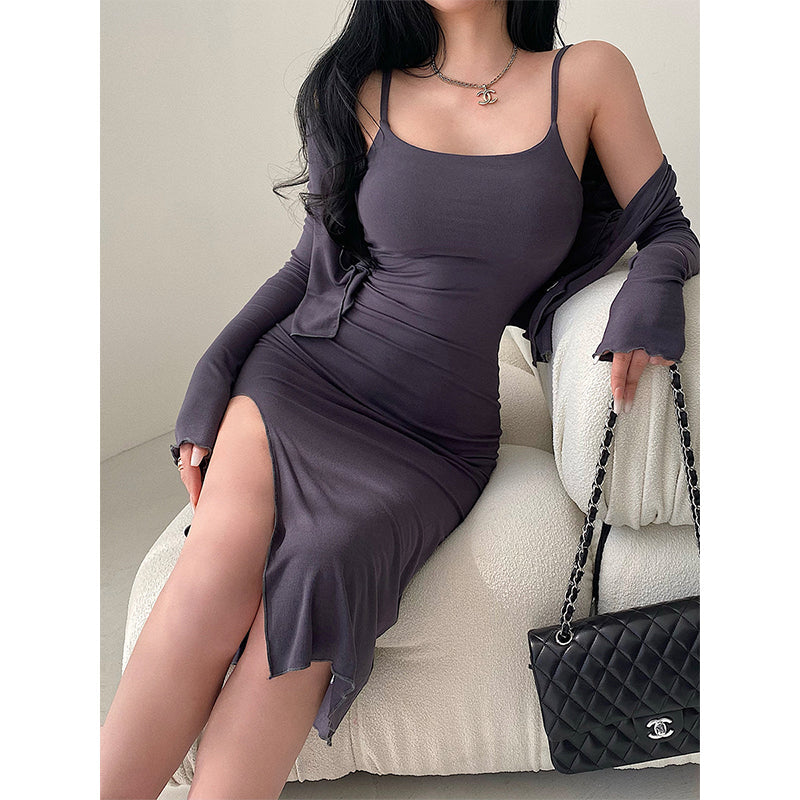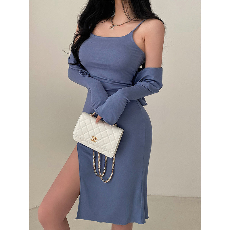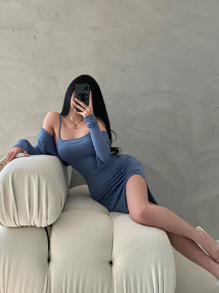 goosudu Valerie Solid Color Sleeveless Side Split Square Neck Short Dress Long Sleeve Cardigan Set