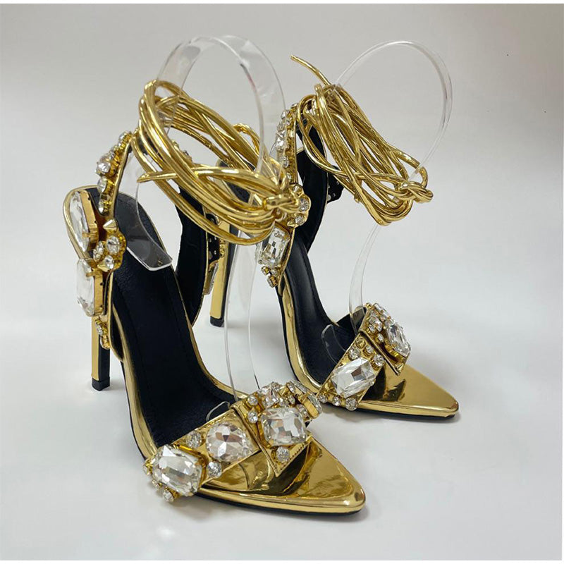 woloong New Summer Women Sandals Female Pu Pointed Toe Crystal Fashion Pumps Ladies Solid Thin High Ankle Strap Sexy Shoes